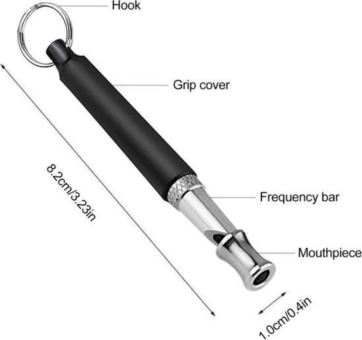 De fluit is zo ontworpen dat het ultrasone geluid alleen hoorbaar is voor uw hondenDeze hondenfluit heeft bereik tot 150 meter. Met frequentie regeling