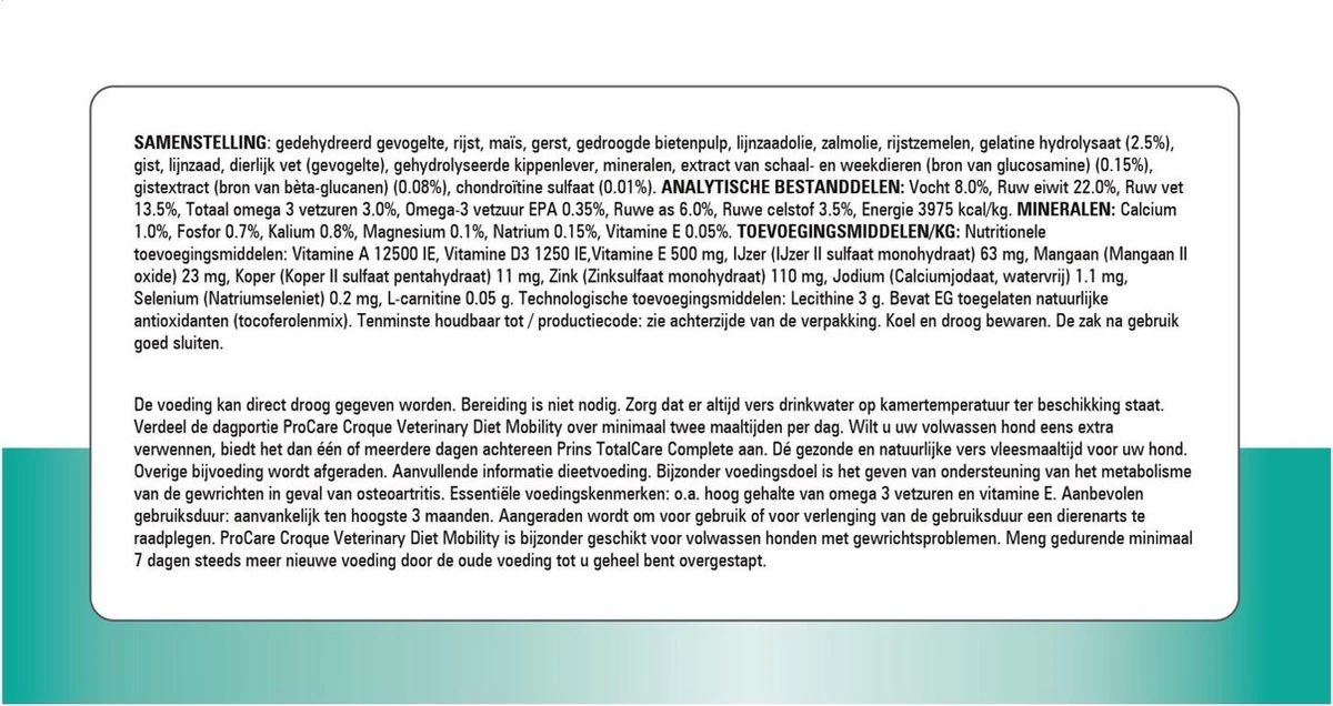 ProCare Croque Dieet Mobility is een krokante dieetvoeding speciaal voor volwassen honden met gewrichtsproblemen. Deze volledige dieetvoeding bevat voedingsstoffen die een positieve invloed hebben op de gewrichten en de beweeglijkheid van je hond, en bijdragen aan een gezonde huid en glanzende vacht.