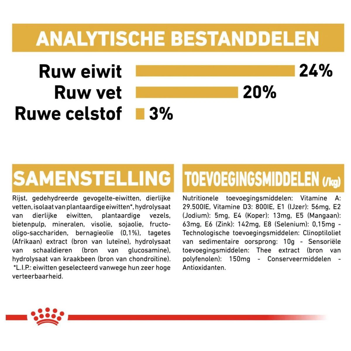 Rijst, gedehydreerd gevogeltevlees, dierlijke vetten, isolaat van plantaardige eiwitten*, hydrolysaat van dierlijke eiwitten, plantaardige vezels, bietenpulp, plantaardige oliën (sojaolie, bernagieolie), visolie, mineralen, Fructo-Oligo-Sacchariden, DL-methionine, natriumpolyfosfaat, L-tyrosine, taurine, extracten uit groene thee en druiven (bron van polyfenolen), L-lysine, hydrolysaat van schaaldieren (bron van glucosamine), Tagetes (Afrikaan) extract (bron van luteïne), L-carnitine, hydrolysaat van kraakbeen (bron van chondroïtine).