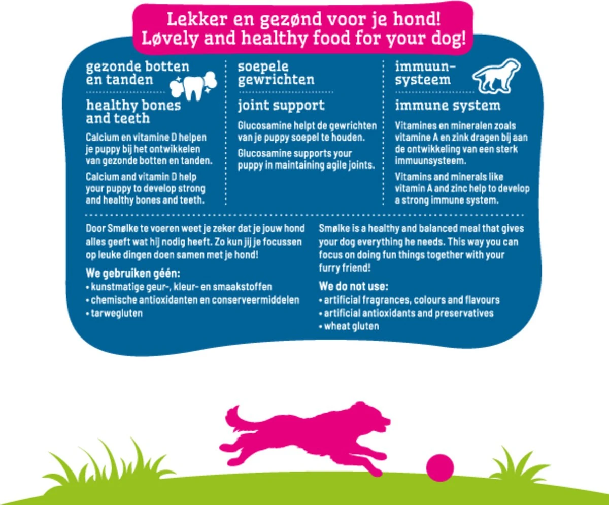 Smølke Puppy Maxi is een complete en uitgebalanceerde voeding voor puppy’s van grote rassen tot de leeftijd van 18 maanden. Voor puppy’s van grote hondenrassen is het belangrijk dat ze niet te snel groeien. Daarom bevat de Smølke Puppy Maxi een aangepast energieniveau wat ervoor zorgt dat u hond de energie krijgt die hij nodig heeft voor een gelijkmatige groei. Daarnaast bevat deze voeding extra beta-glucanen om het kwetsbare immuun systeem optimaal te ondersteunen. Een ideale fosfor/calcium verhouding helpen uw pup de ontwikkeling van een sterk en gezond skelet en gebit. Daarnaast wordt de grote groei van het skelet ondersteund door de toevoeging van Glucosamine en Chondroïtine.